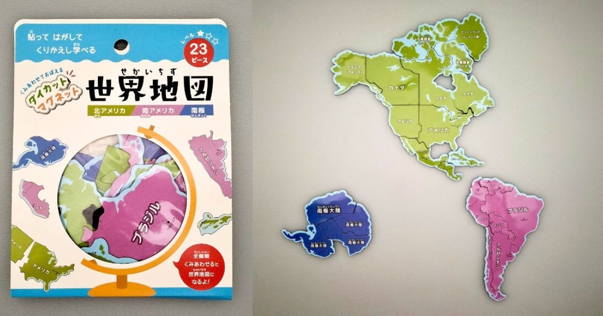 先日100均セリア(Seria)で見つけたダイカットマグネット「世界地図」シリーズ。購入したのは「北アメリカ・南アメリカ・南極」、「ヨーロッパ・アフリカ」、「アジア・オセアニア」の3つ。