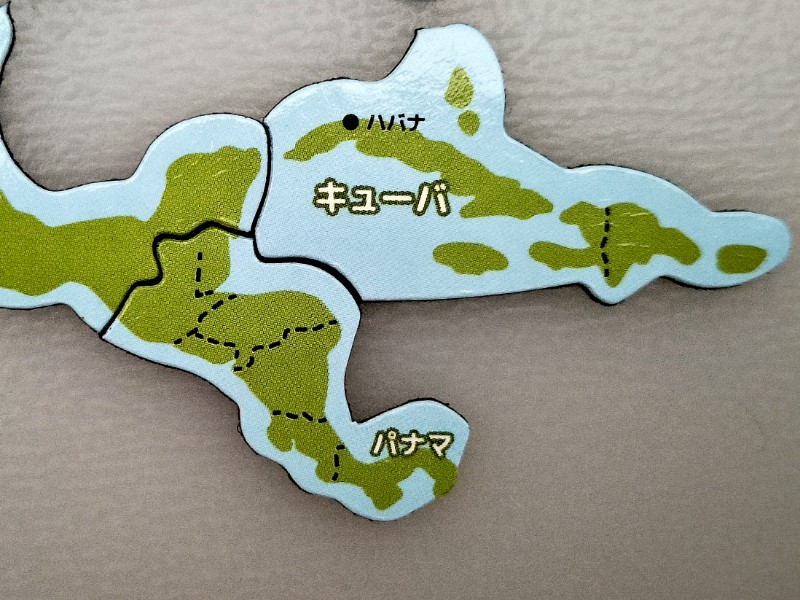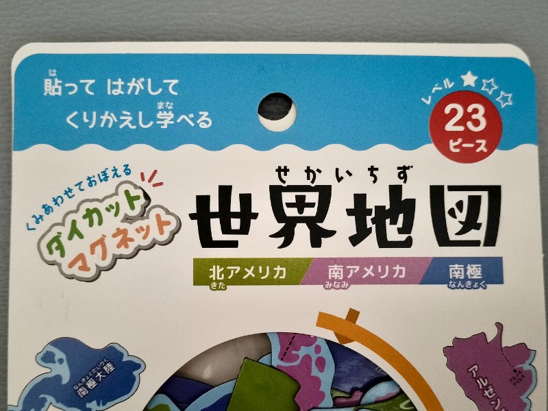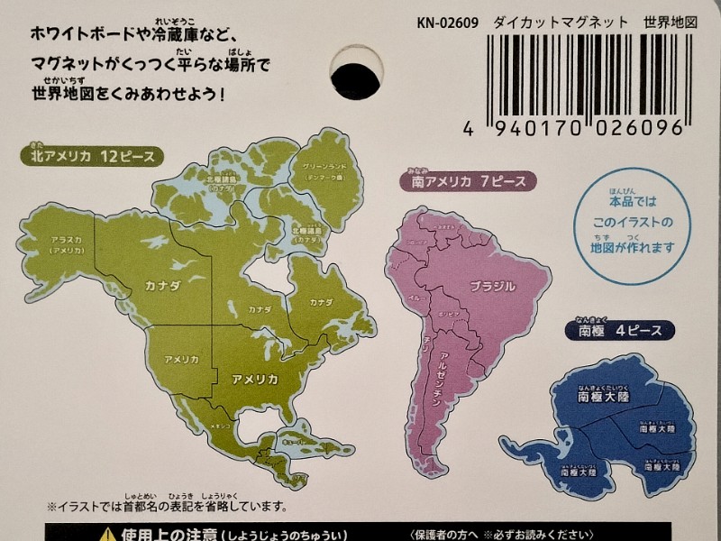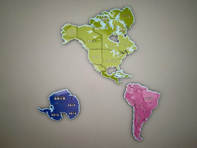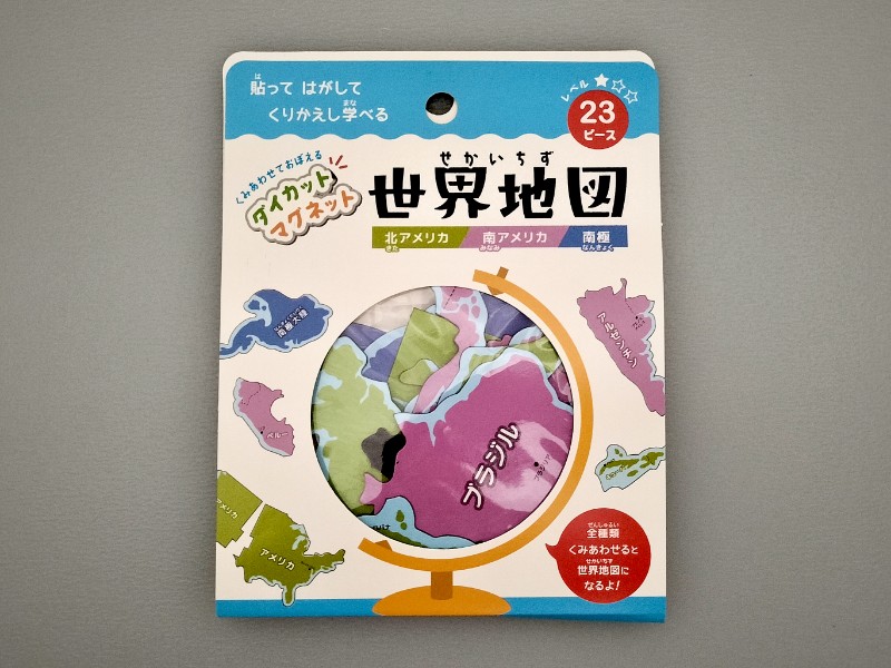 今回は机の上でやってみたけれど、本来マグネットなので「ホワイトボードや冷蔵庫などマグネットがくっつく平らな場所で世界地図をくみあわせよう!」というもの。北米大陸だけでB5サイズくらいの大きさだったので、全3種類を並べて作るとどのくらいのスペースが必要なのか今の時点ではわからない。