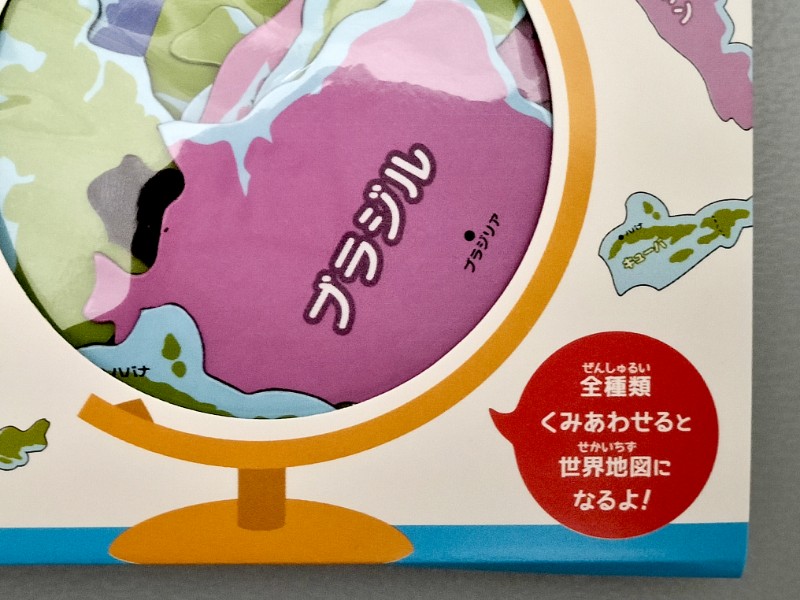 「全種類くみあわせると世界地図になるよ!」と書いてある。ちなみに全種類は3種類。