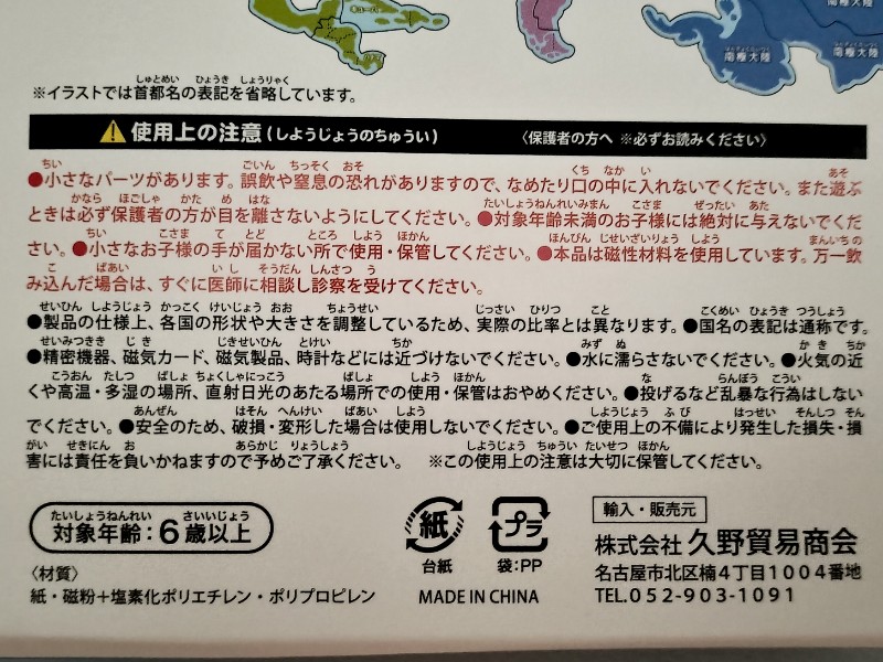 「製品の仕様上、各国の形状や大きさを調整しているため、実際の比率とは異なります。」「国名の表記は通称です。」ということで、対象年齢は6歳以上。