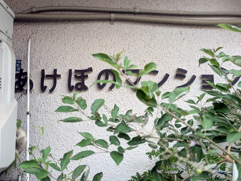 5つ目、『あけぼのマンション』。文字が木に覆われて見づらいが、レトロな書体。
