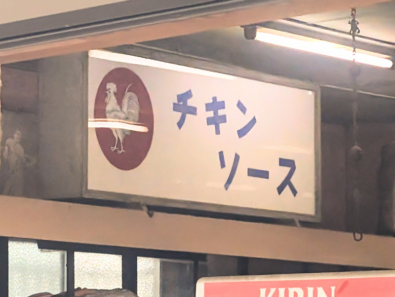 店の中にある看板が当時のまま残っている。チキンソースに……