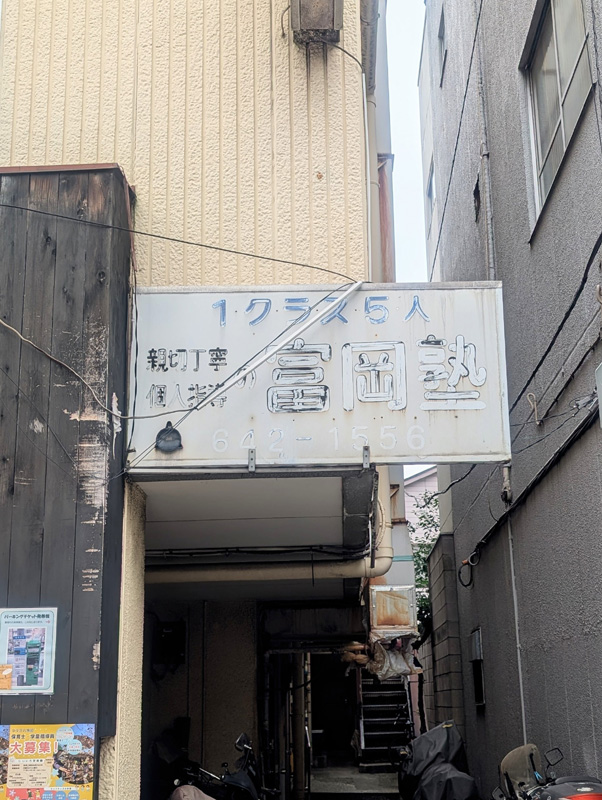 4つ目は『冨岡塾』。1クラス5人、新設丁寧、個人指導の塾だ。看板の文字が消えかかっているのが昔からやっている証拠。