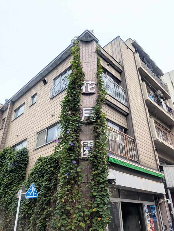 5つ目は『花月園』。冨岡八幡宮そばの花屋さん。時間帯的に朝顔でなく昼顔なのかもしれないが、それが絡まる看板が雰囲気あっていい。