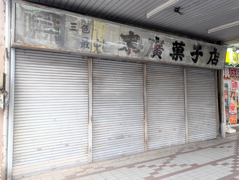 6つ目は『末廣菓子店』。こちらは現在閉店している。うっすら喫茶とか三色最中の文字が残っている。