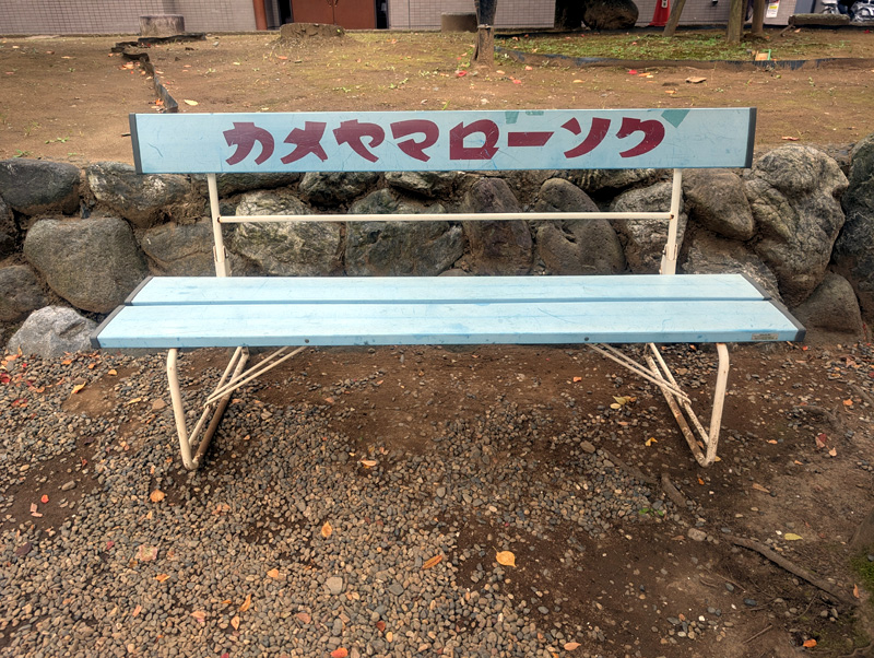 寺社に行くと良く見かけるカメヤマローソクのベンチ。このロゴがかわいらしい上にレトロでいい。