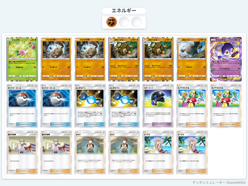 イエッサンexが2枚だと、ナツメやアカギなどやられた時にきついので、片側をシェイミにしているのがポイント。その分回復する数値が少なくなるがそれも仕方なし。昔のカードが輝くのは嬉しい。