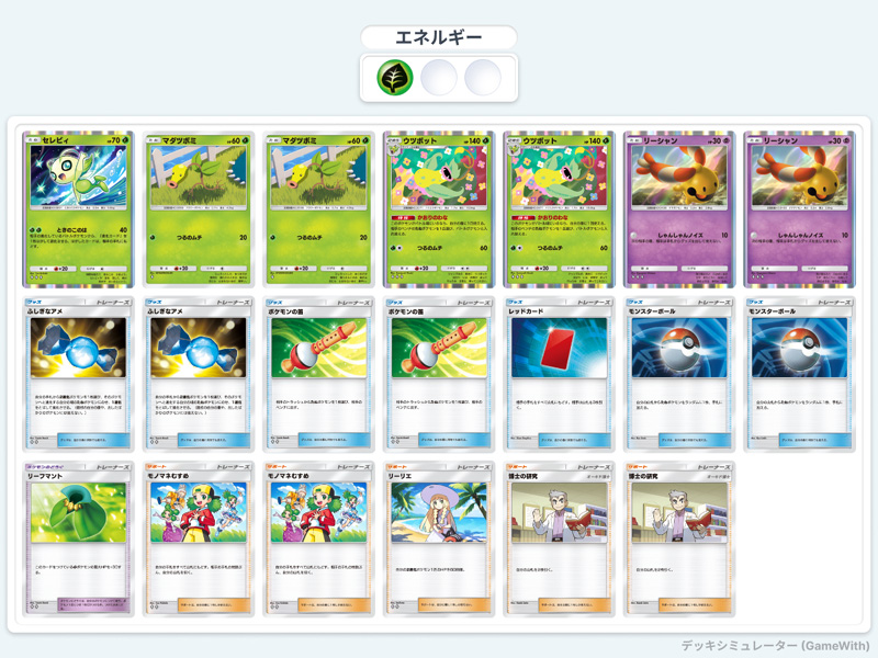 リーシャンで相手の妨害をしつつ、たねポケモンならウツボットで呼び寄せ、進化ポケモンならセレビィで退化させる。そして退化したのがまた出てきたら、ウツボットで刈り取る。さらに笛で呼び寄せてウツボットで刈り取ることもできる。