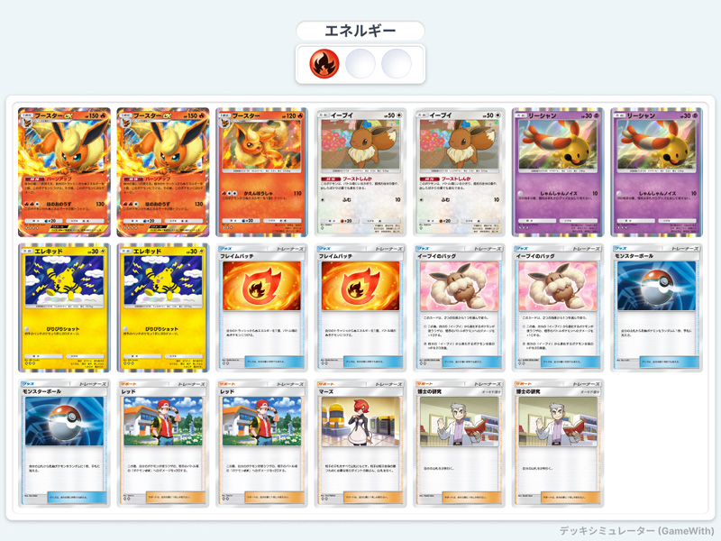 このデッキは本当に驚いた。作った人がすごいなと思うデッキ。基本リーシャンやエレキッドで殴りつつ、エネルギーをあえてどれにもつけずに流す。そうすることでブースターexの特性や、フレイムパッチで持ってくる。