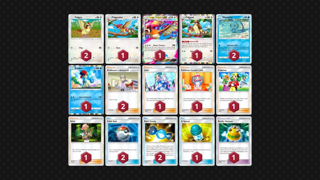 直近の海外大会で上位入賞者が使用したデッキがこちら。メガピジョットexとノーマルピジョットを両方積んだもの。ロケット団の下っ端とナツメがずっとエンドレスに続くような感じになるのか?マナフィでエネ加速というのも面白い。