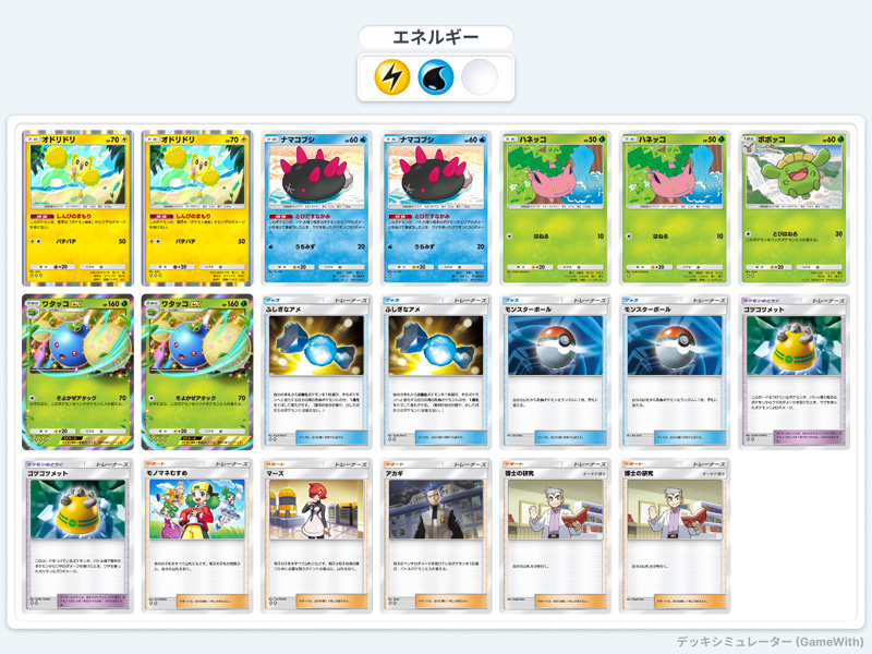 それの繰り返しをしているだけで、exしかないデッキには勝てる。オドリドリ対策をしてきてるデッキでも、ナマコブシとゴツメで70ダメージ与えられる。そこをワタッコで攻撃してさらにダメージを追加する。